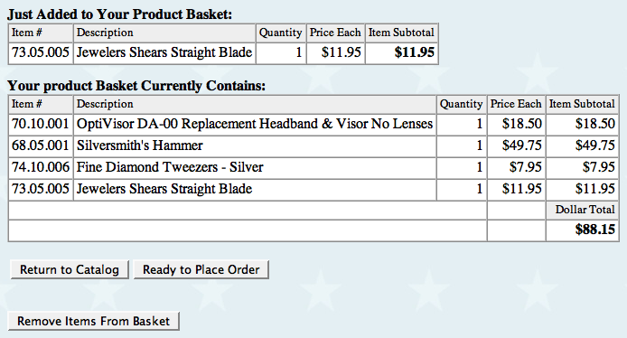 After uploading an item to your shopping cart, you'll be presented with this form containing a summary of the items currently contained in your basket. Use the "Return to Catalog" button to continue shopping and adding other items to your online order. To delete an unwanted item inadvertently added to your basket, use the "Remove Items From Basket" button. To edit your quantity or inches of any given product silver gold etc. use "Return to Catalog" and enter the desired quantity or inches of the product needing change.